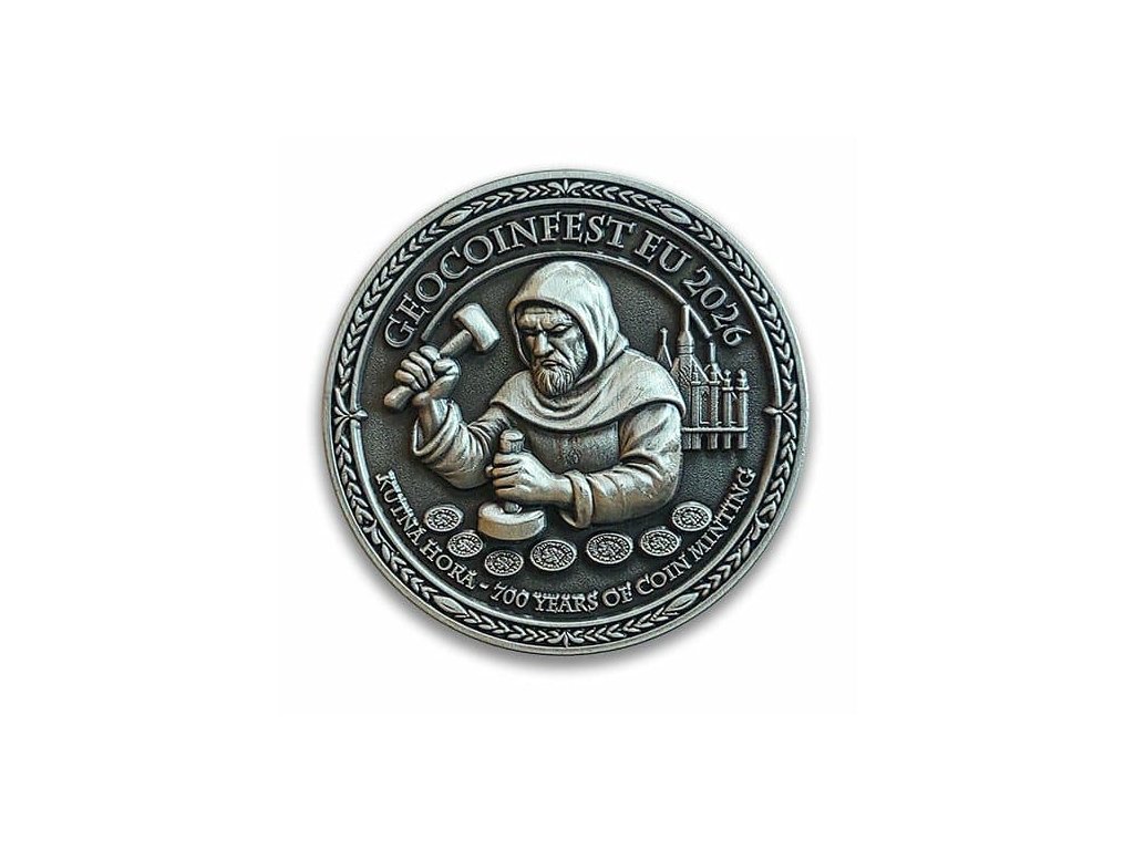 Originální geocoin navržený Slávkem Hoblíkem / geokeš.cz pro Mega-event GeoCoinFest EU 2026. Unikátní trackovatelný kód je uveden na boku geocoinu.