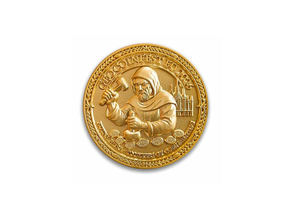 Originální geocoin navržený Slávkem Hoblíkem / geokeš.cz pro Mega-event GeoCoinFest EU 2026. Unikátní trackovatelný kód je uveden na boku geocoinu.