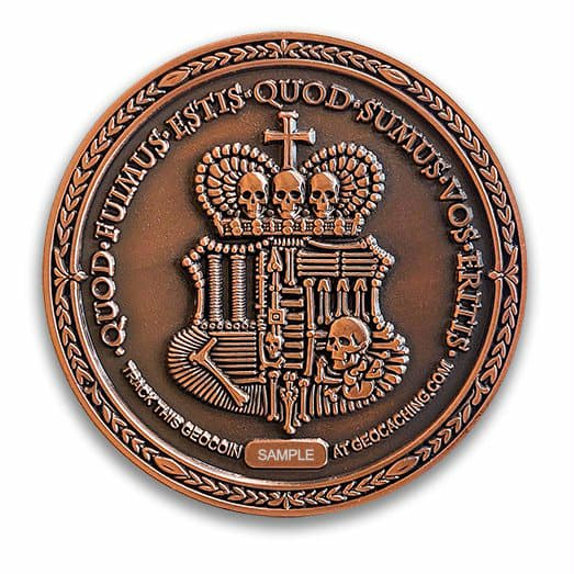 A unique trackable code is printed on the side of the geocoin. Geocoin dimensions: 50.8 mm and 4 mm thick.